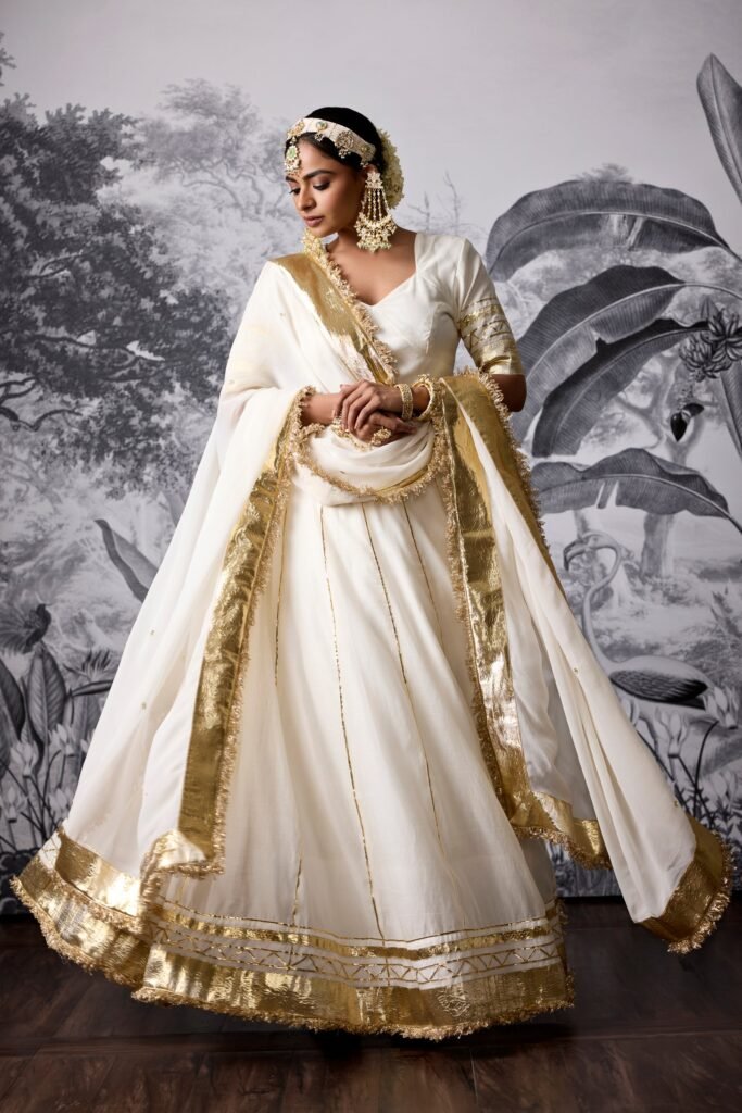 Each piece features hand-sewn Gotta Patti, a timeless Rajasthani art of appliqueing zari ribbon into elaborate designs. These feature on the hems of the lehenga skirts, daintily laced on the edges of a dupatta and as striking patterns adorning the neckline.