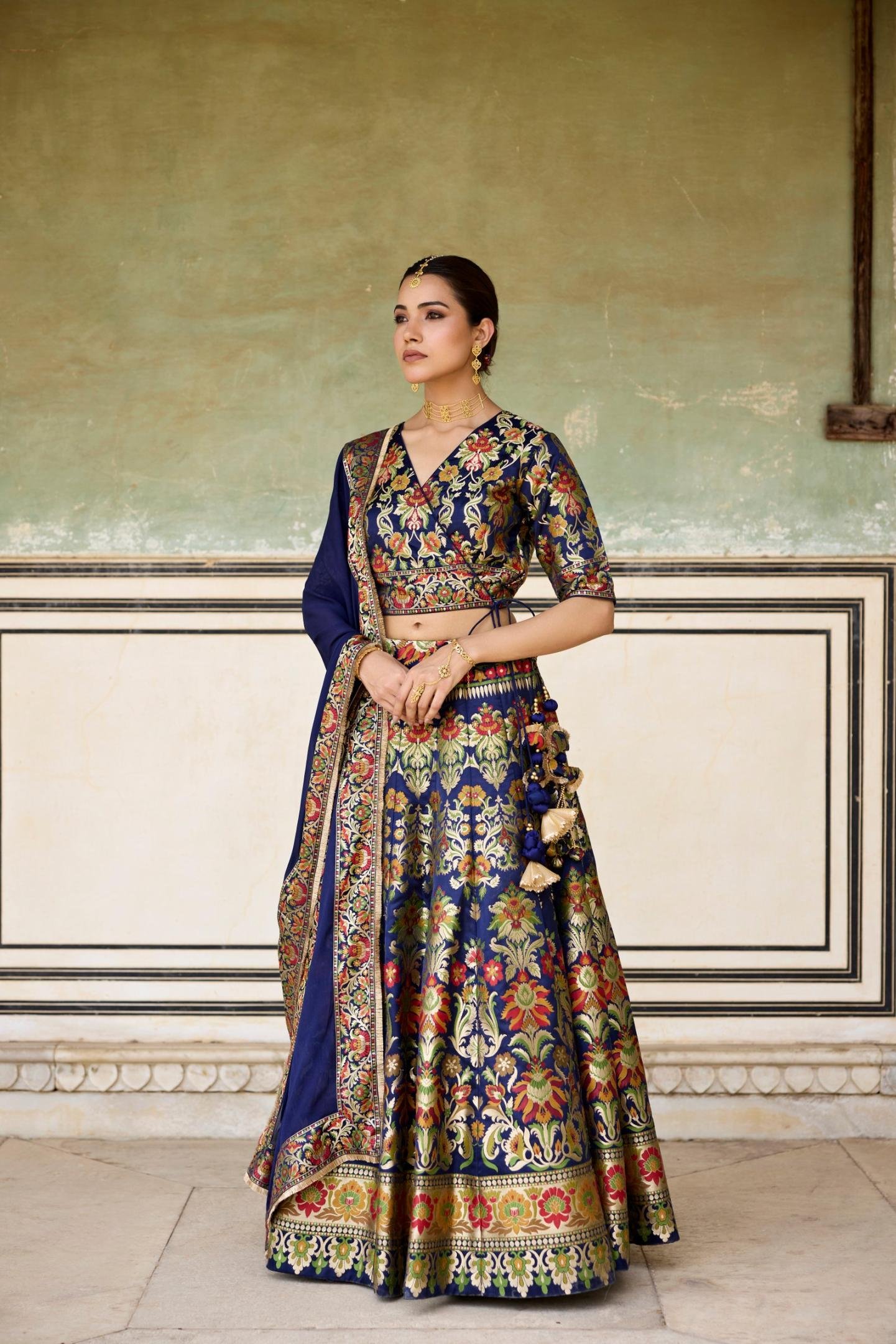 This classic deep emsemble from our collection DHAROHAR, is a masterpiece crafted from handwoven Banarasi fabric. It is a set of a beautiful multi-panelled lehenga, paired with an angrakha blouse, along with a long chinnon dupatta. The lehenga and the angrakha blouse have beautiful tassels, that make them even prettier. The rich Chinnon dupatta has a beautiful Banarasi border along with Kiran lace.