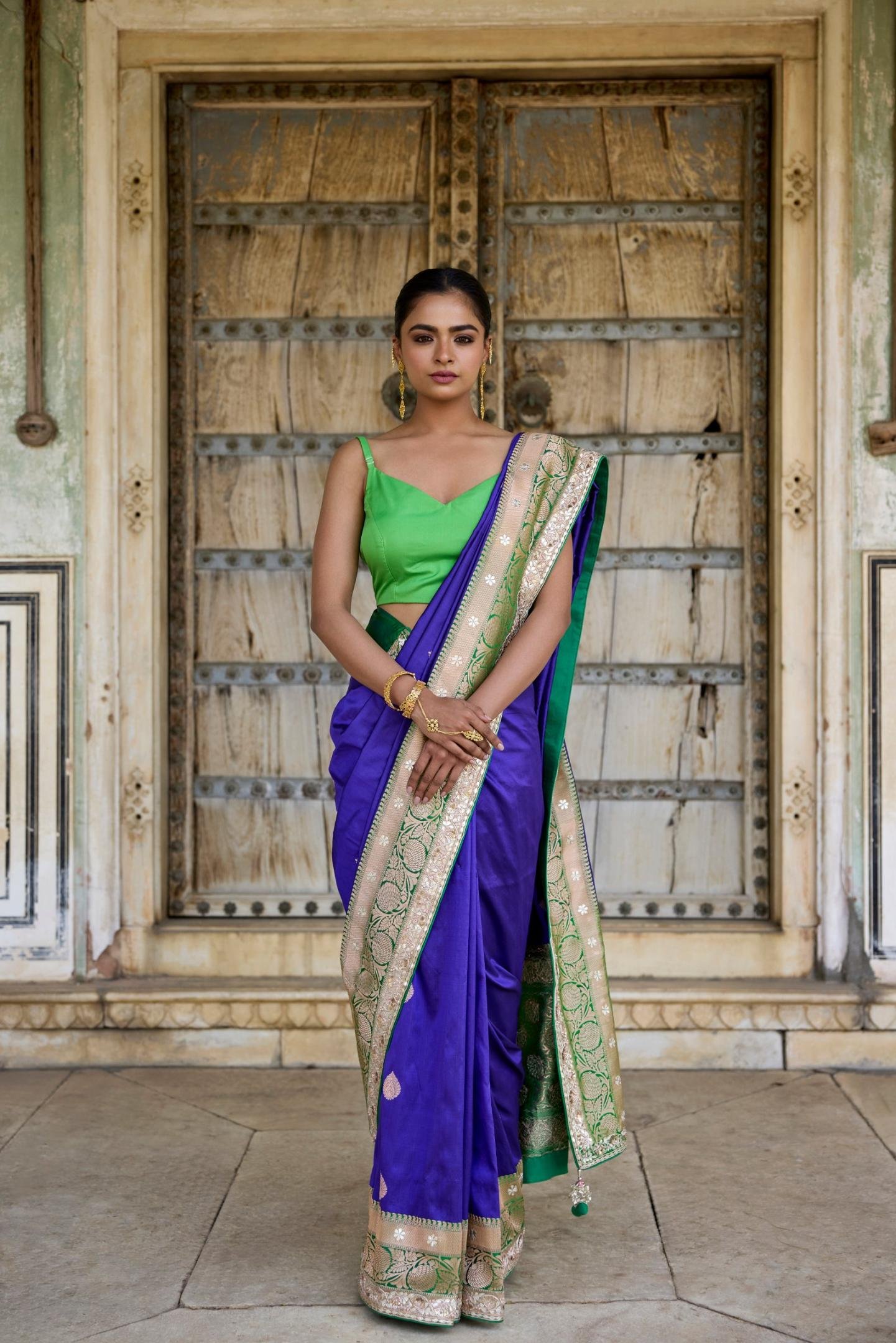 This bright Purple saree with Green border from our DHAROHAR collection, is fabricated in Banarasi silk with Gota Patti border with pallu fully embellished with Gota Patti motifs.