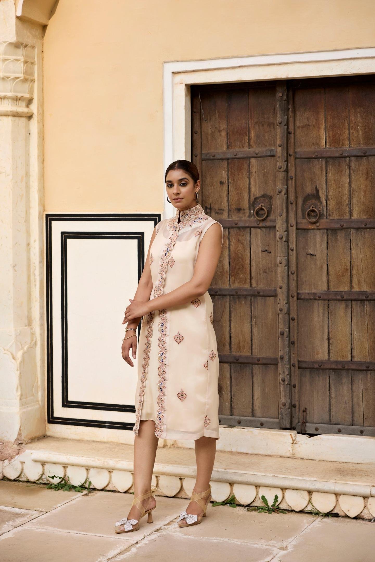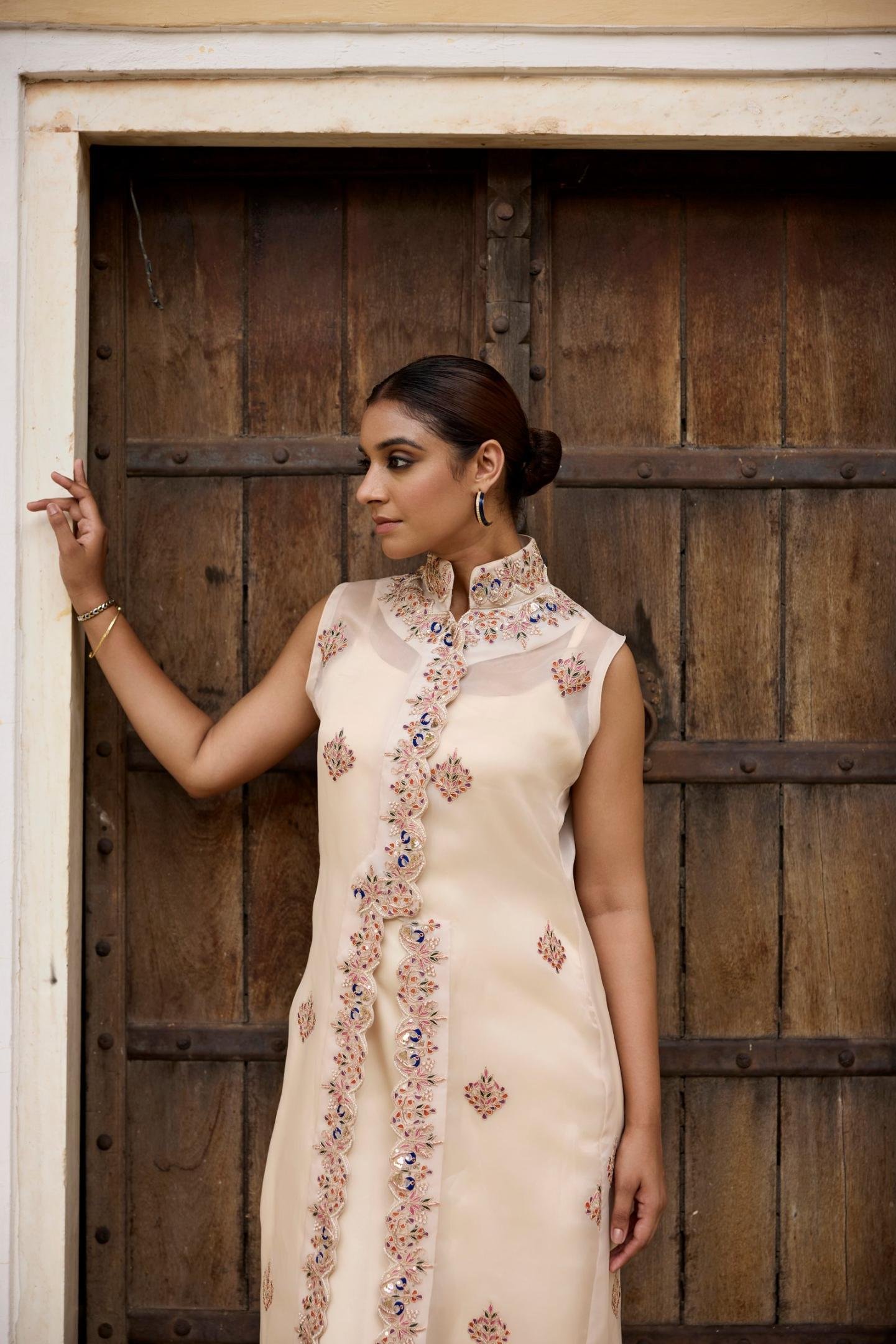 Embrace comfort and style effortlessly with this chic ensemble, designed to elevate your look. The ravishing Gota Patti Jacket Set features the Embellished Organza Jacket and slip, adding a touch of tradition-inspired charm to your wardrobe. Embellished with colorful Gota Patti, this outfit offers both style and comfort, making it perfect for Indian chic look.