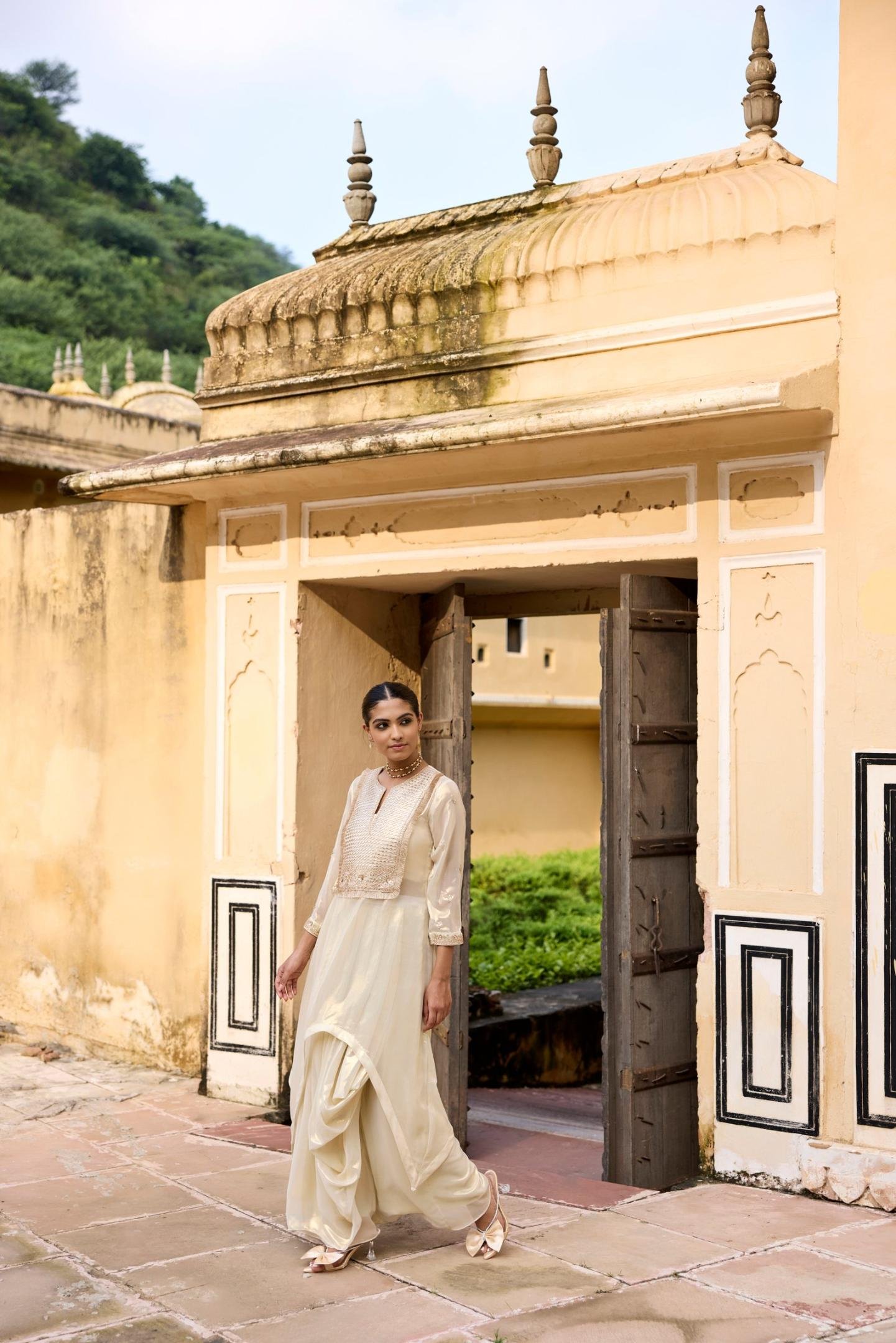 Crafted with meticulous care and attention, this ensemble is a symphony of elegance and refinement. The Golden Tissue Assymetric Kurta having the Gota Patti embroidery and pretty Kinari Lace, drapes gracefully across the silhouette, showcasing the breathtaking artistry. The beautiful pant has the cowls draped from the same pretty Tissue fabric over the solid satin base, showing how timeless beauty meets modern fashion. The tailored crop top has the Pleat detailing in front and the elasticated back, giving it a textured yet body hugging look.