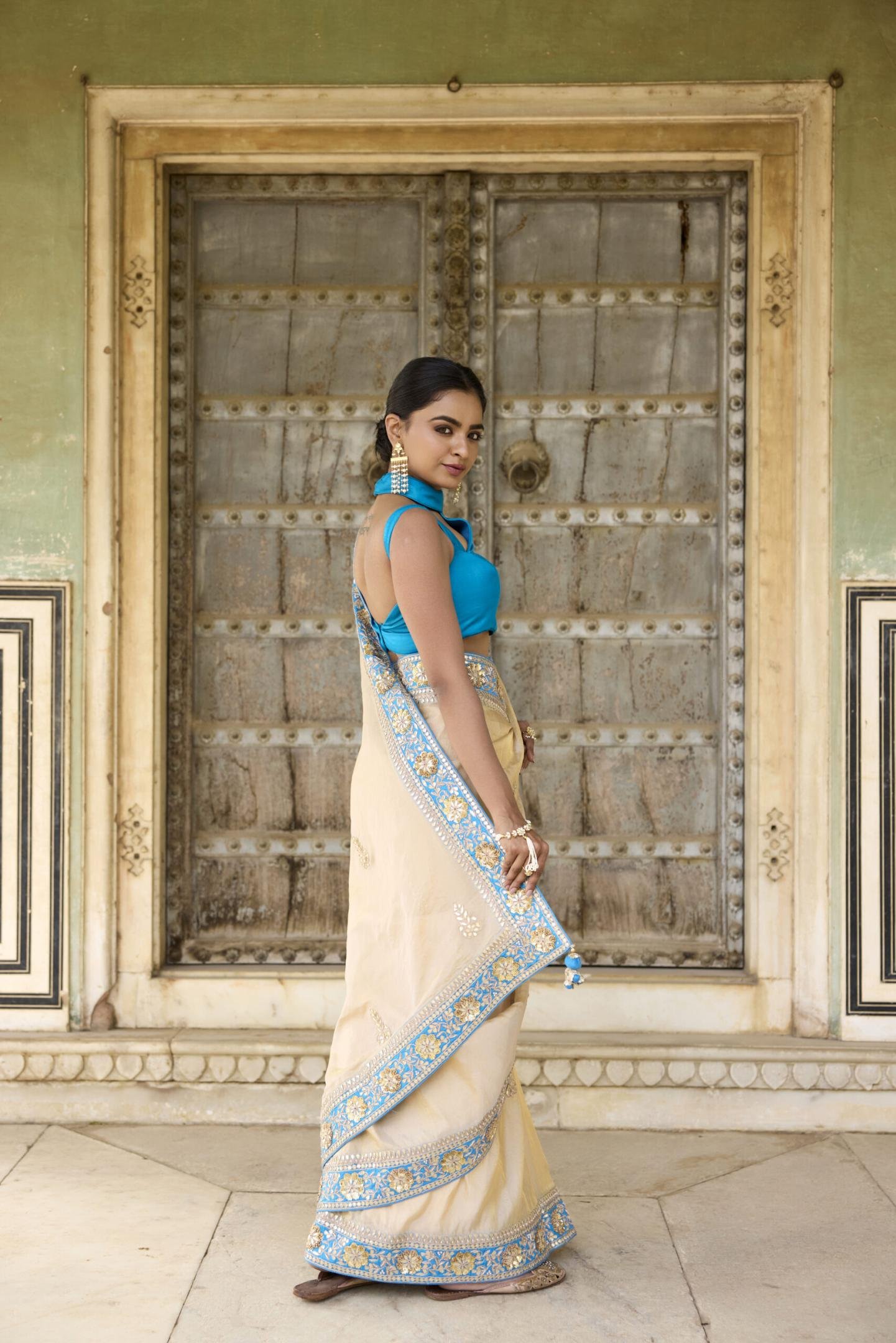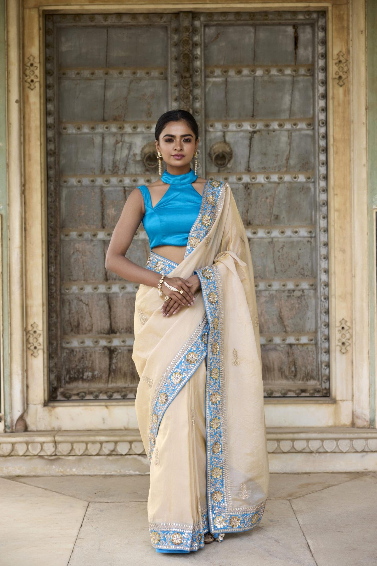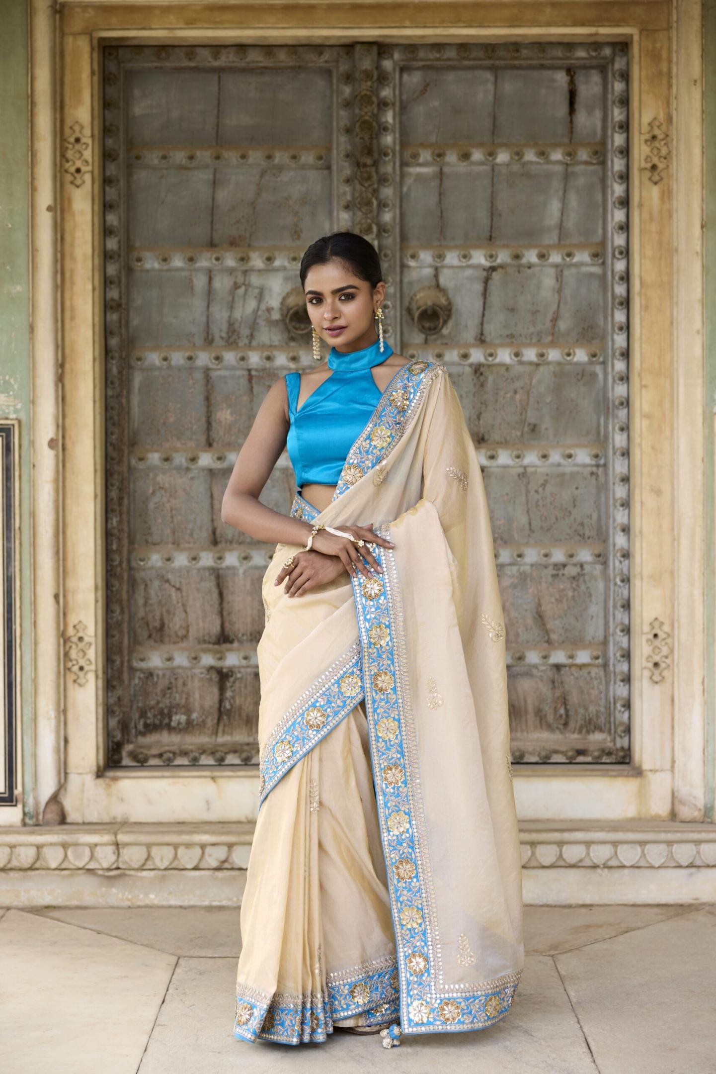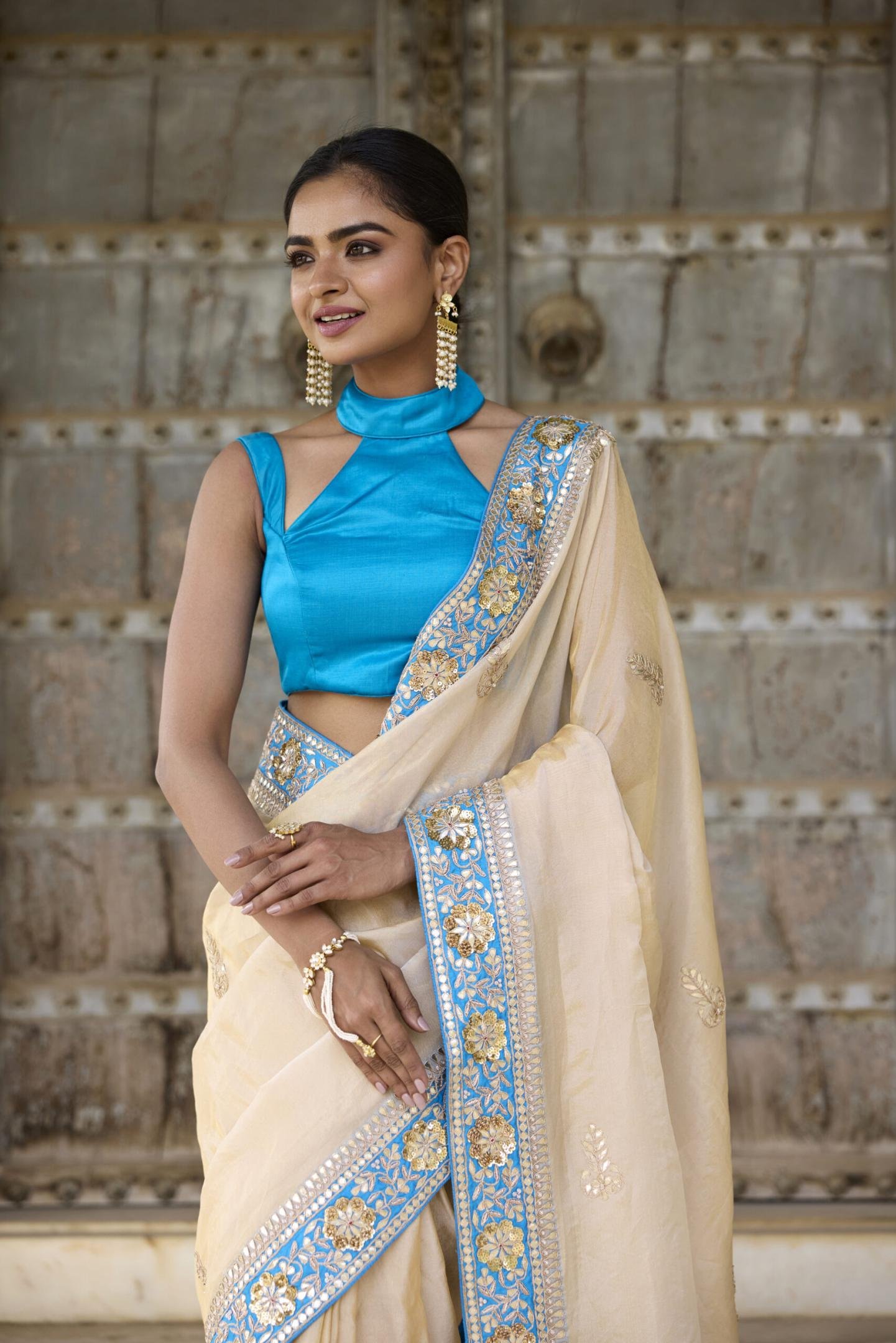 This rich Golden saree fabricated in Tissue from our KARIGARI collection, has Gota Patti border on blue base along with Gota Patti Buttis at pallu.