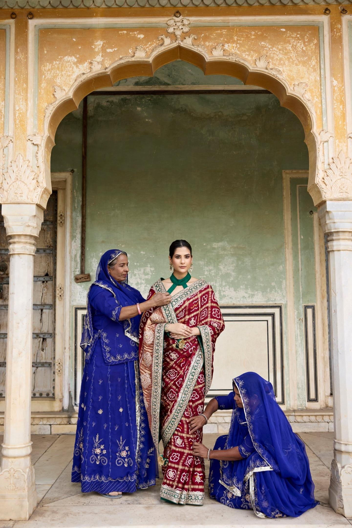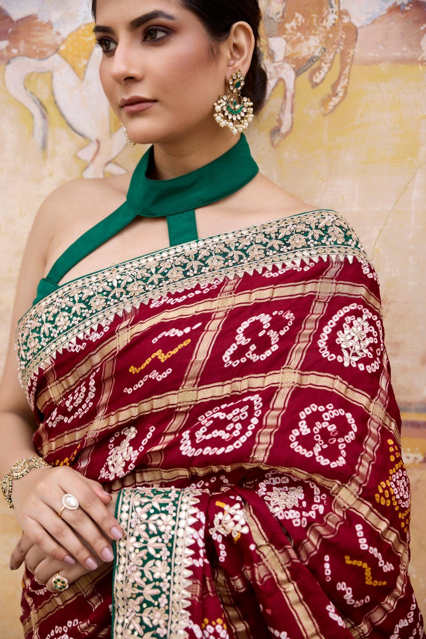 This deep Maroon Bandhni saree from our KARIGARI collection, is fabricated in Silk with Zari checks, having amazing Gota Patti border with Emerald green base.