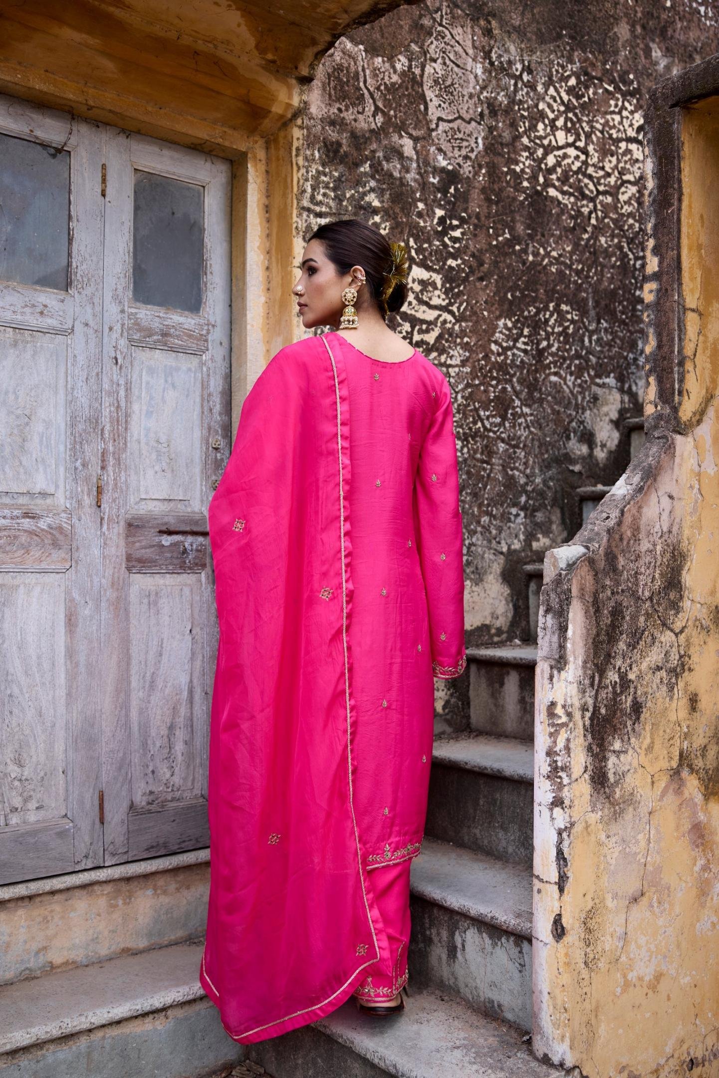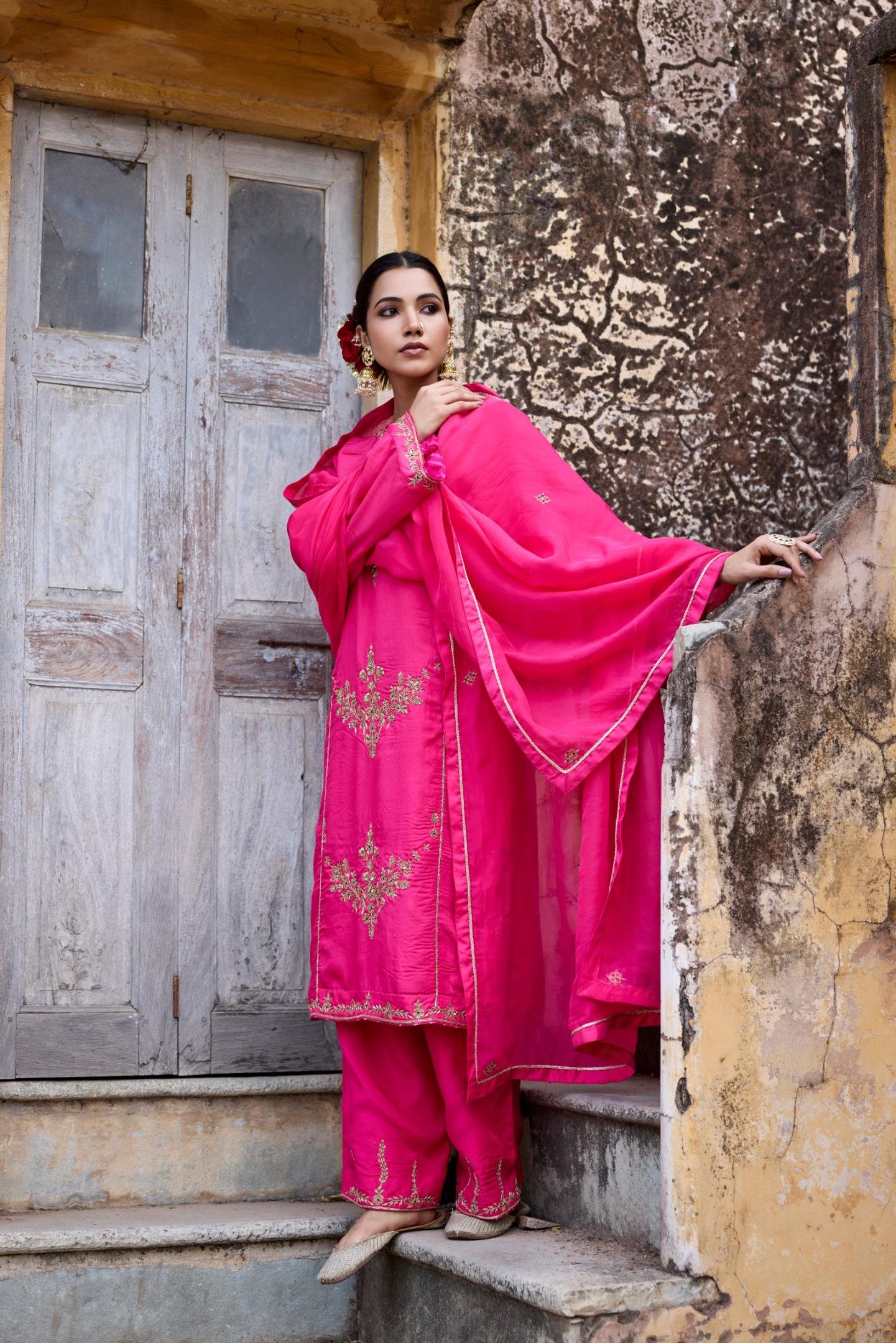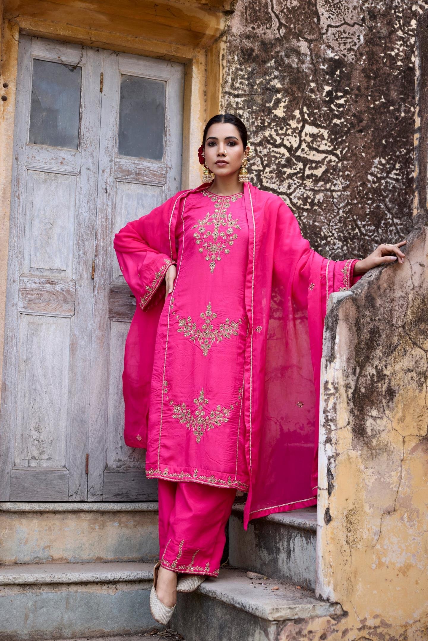 Colour yourself in this shade of bright pink with this amazing kurta set from our KARIGARI collection. This zardozi embroidered set includes heavy work Kurta with long flared sleeve, and loose fit pant having embellished bottom. The dupatta along with this has a solid border and Dori framing the inner edge of the border.