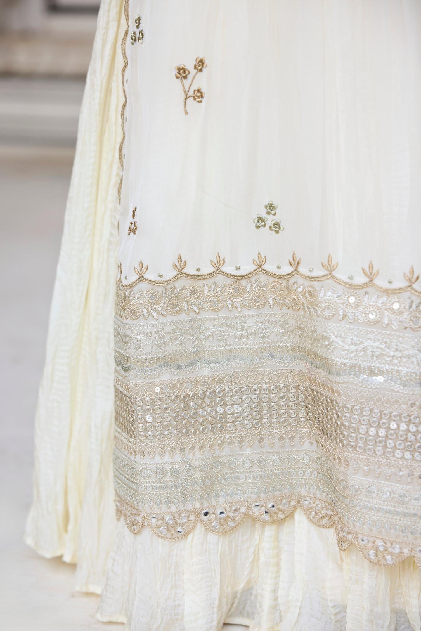 Crafted from the lucent organza and rich Upada Silk, our Kurta set from CHAMAK collection, is embellished with machine embroidery, adding the authentic Indian charm to it. The details like intricate laces in the organza kurta bottom hem and sleeves hem add a flavour to this suble and decent ensemble. The crop top and flared skirt in Upada Silk are the base element of the look.