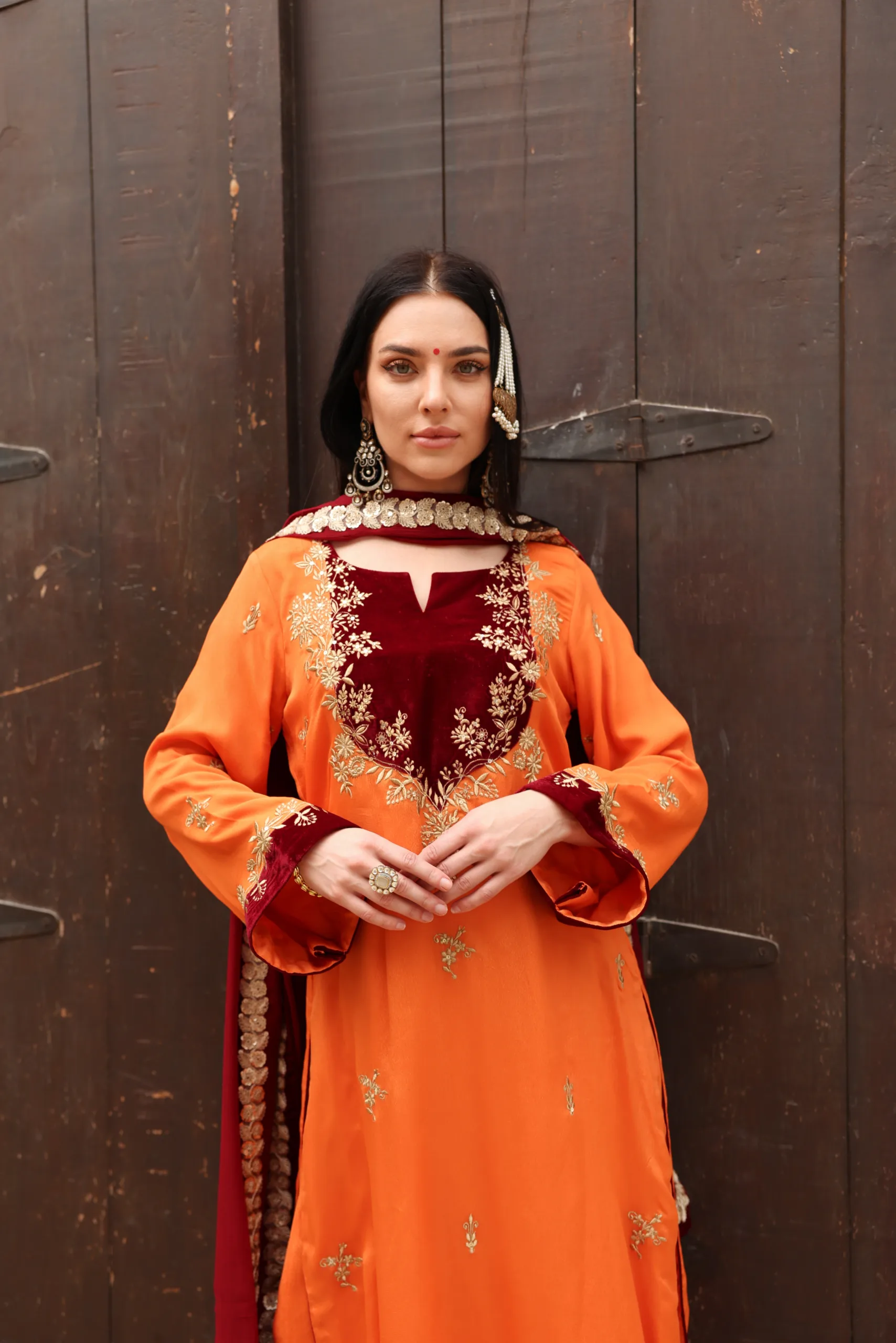 Straight-fit kurta with side slits paired with full-elasticated flared Sharara, having dupatta with scallop edge detail. There will be a slight variation in the colours and embellishments on the products as they are hand – crafted.