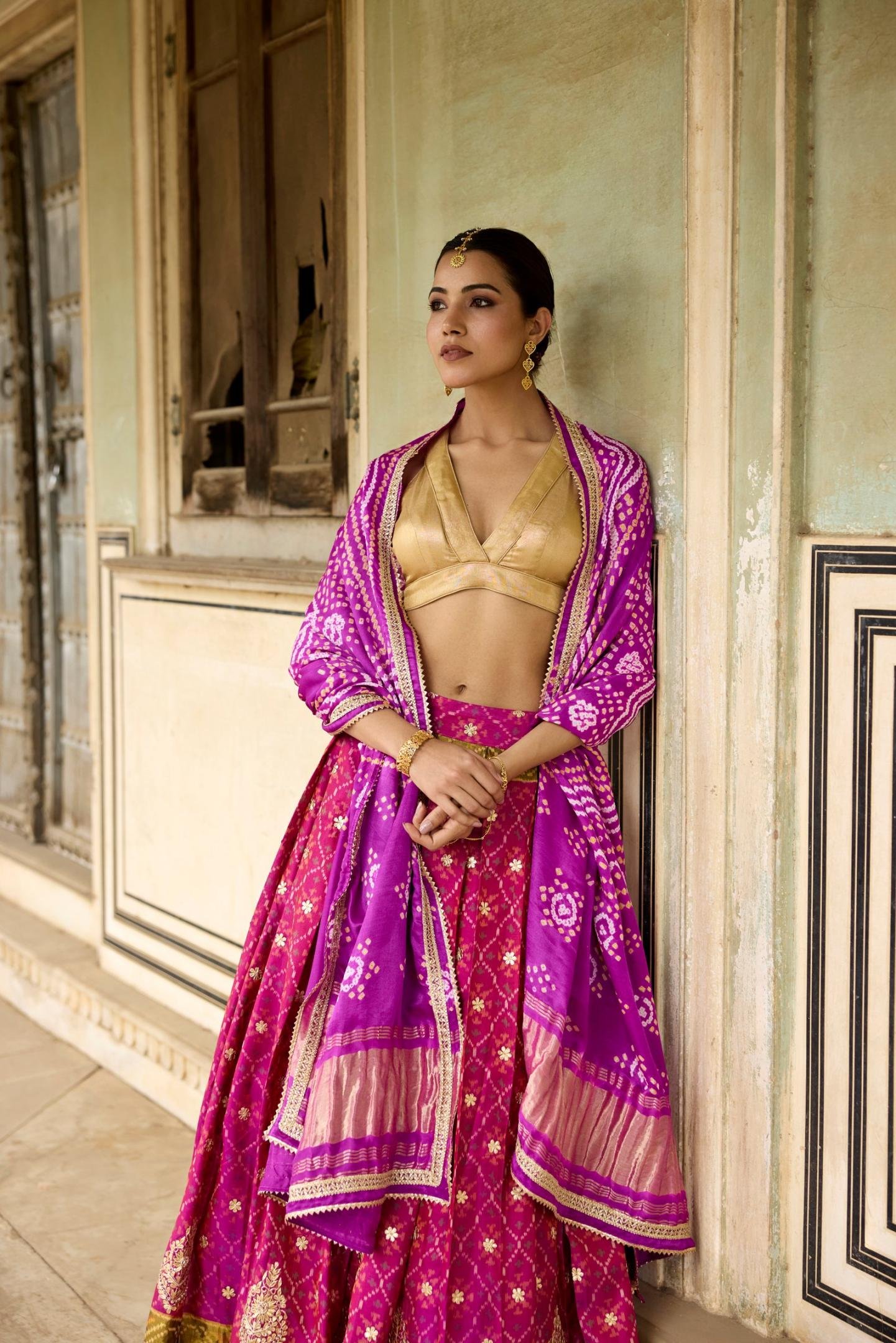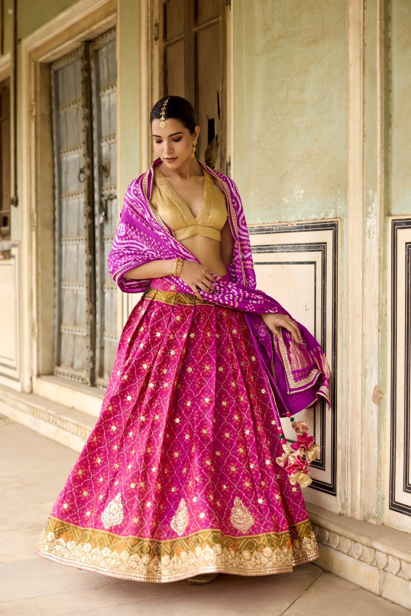 This lehanga set from our DHAROHAR collection, is crafted from rich double – weave Patola fabric, one of the finest traditional fabrics of fabrics of India. This lehenga and kurti were made after getting Gota – Patti embroidery done on the Patola. Silk Bandhni dupatta, which is another Indian textile, is paired with this pleated lehenga and kurti. The colorful tassesls are attached to add grace to it. The golden border on dupatta completes the look.