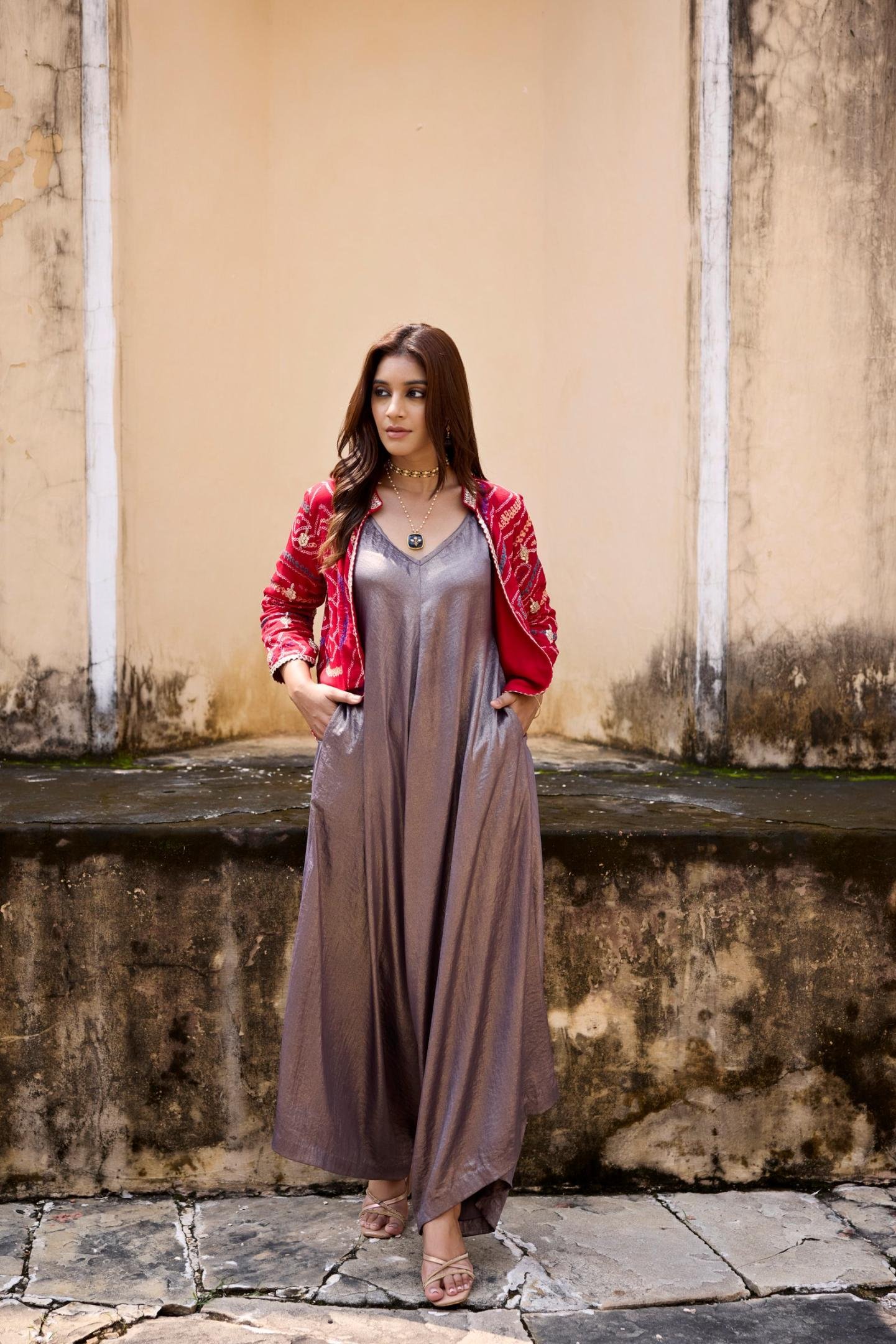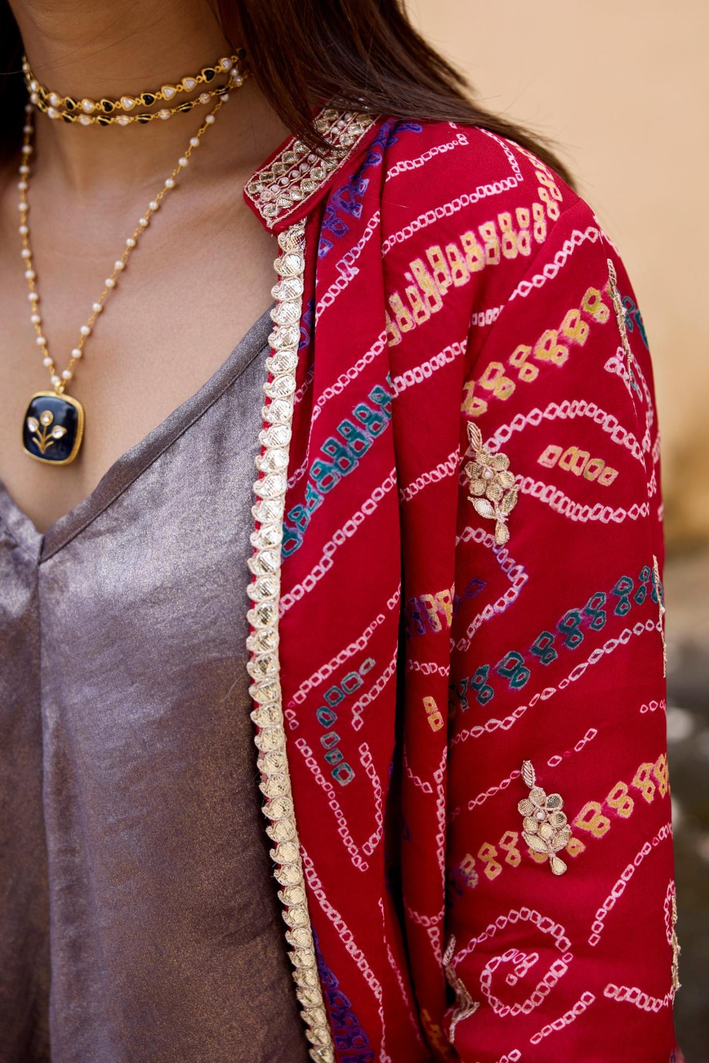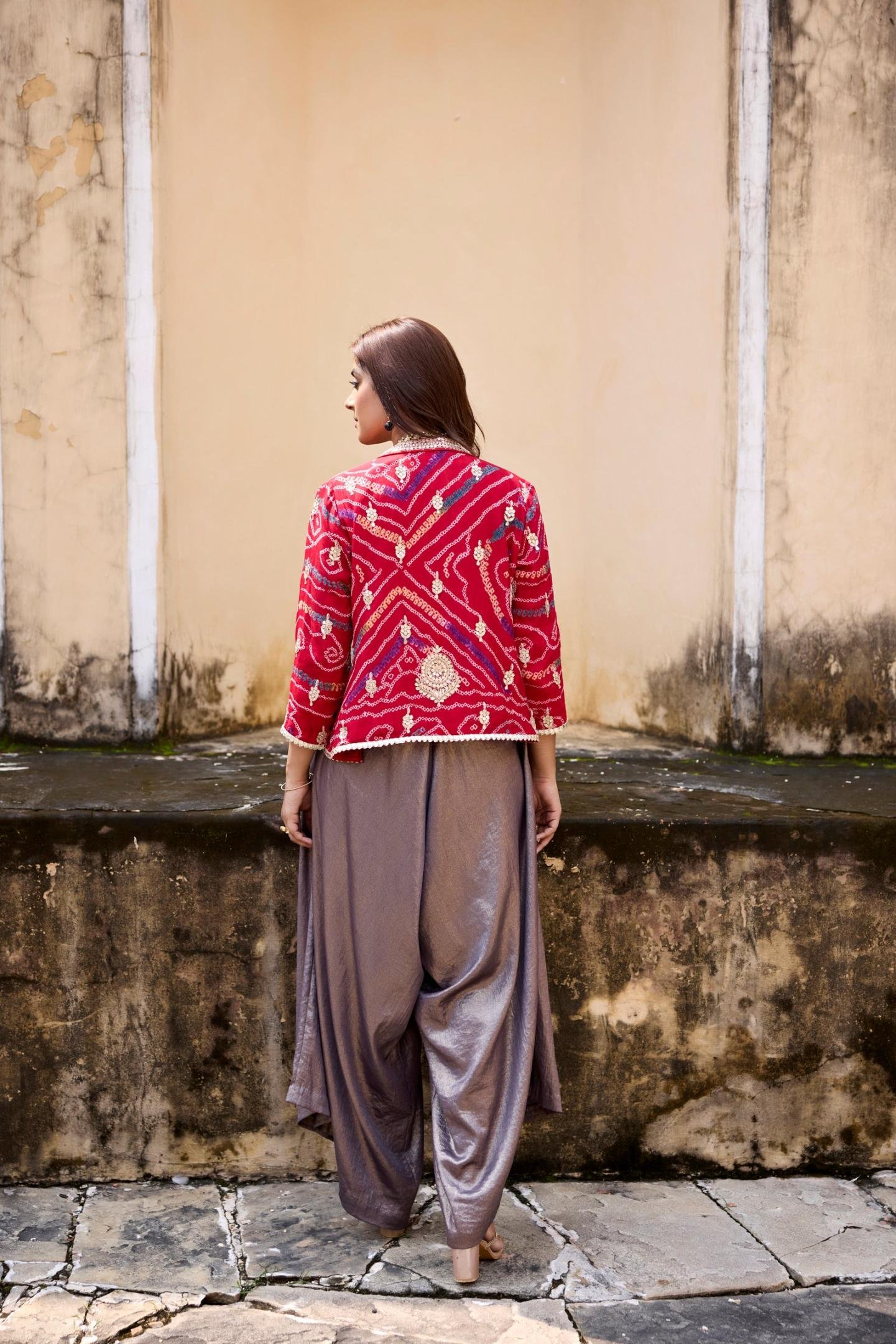 Crafted from shiny Shimmer Satin and Pure Georgette Bandhni, our Jacket-Jumpsuit set from CHAMAK collection, is embellished with traditional Gota Patti embroidery, adding the authentic Indian flavour to it. The details like border lace on jacket and pockets in jumpsuit add a flavour and functionality to this suble and decent ensemble.