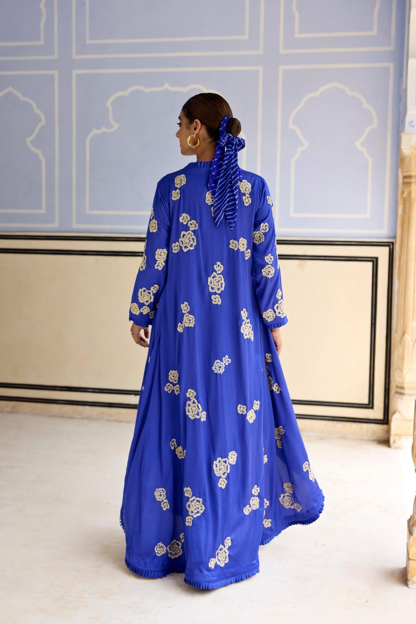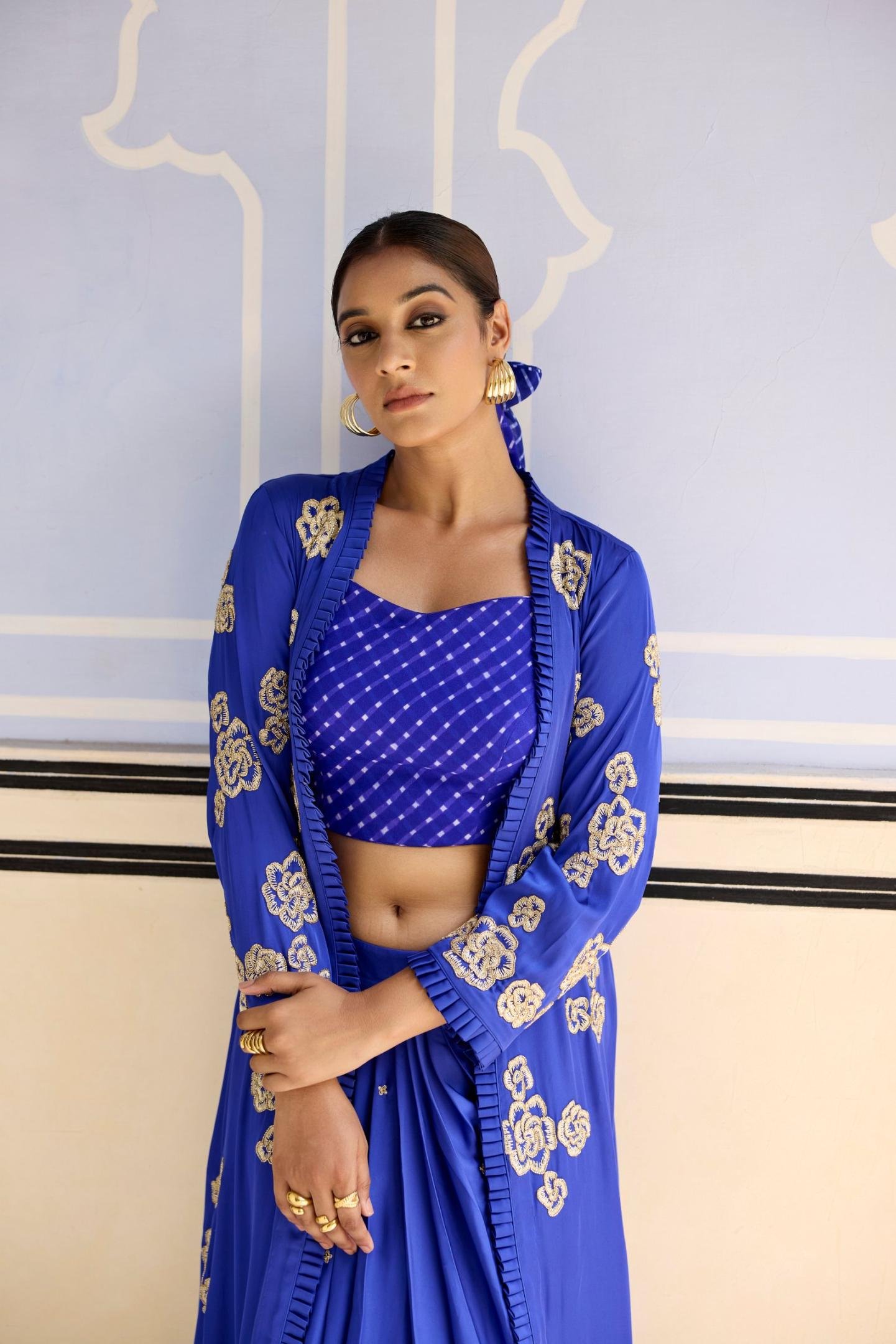 Introducing our Royal Blue Dhoti Cape Set with Draped Skirt and Cape ensemble ? a fusion of sophistication and vibrant flair. Crafted to captivate, this ensemble boasts exquisite thread and bead work embroidery meticulously embellished on a silky satin cape, perfectly paired with a flowing drape dhoti skirt and complemented by an elegant Mothda crop top. The frill on the edge of the cape is the cherry on the top.